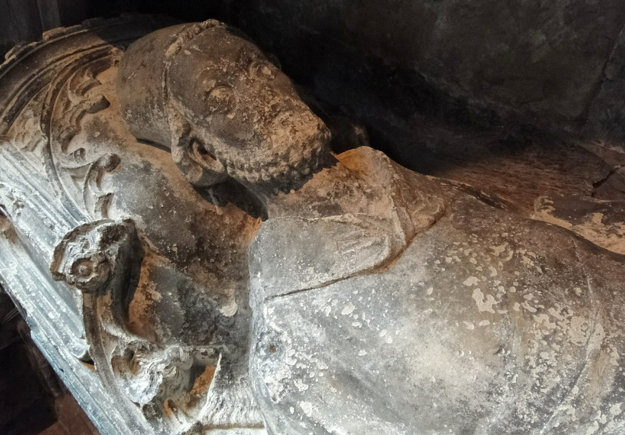 The effigy’s face reveals a different story. The curly beard and textured hair remain intact, preserving the sculptor’s original attention to natural form and personal likeness. Yet the central facial features — the nose and lips — show signs of having been worked down, smoothed, and reduced.