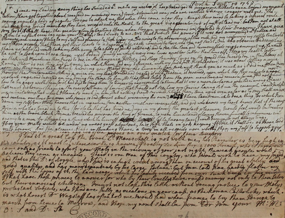 Sir, since my landing everything has succeeded to meet my wishes, it has pleased God to prosper me hitherto even beyond my expectation, I have got together about 3000 (and am promised more), brave and determined men who are resolved to die or conquer with me. The enemy marched a body of regular troops to attack me but when they came near they changed their mind by taking a different route and making forced marches they have escaped into the north to the great disappointment of my highlanders: but I am not at all sorry for it, I shall have the greater glory by beating them when they are more numerous and supported by their dragoons. I have occasion to reflect every day upon your majesty’s last words to me, viz [namely] that I would find power if it was not accompanied with justice and clemency, one uneasy thing to myself and grievous to those under me. ‘Tis [It is] owing to the observance of this rule and my conforming myself to the customs of those people that I have got their hearts to a degree not to be easily conceived by those who do not see it. One who observes the discipline I have established would take my little army to be a body of picked veterans; and to see the love and harmony that reigns amongst us, he would be apt to look upon it as a large well-ordered family in which everyone loves another better than himself. I keep my health better in these wild mountains than I used to do, in the campanie felice [happy company], and sleep sounder lying on the ground than I used to do in the palaces at Rome. There is one thing and but one, in which I have had any difference with my faithful highlanders, it was about setting a price upon my kinsman’s head, which knowing your majesty’s generous humanity I am sure will shock you are much as it did me, when I was shown the proclamation setting a price on my head. I smiled and treated it with the distain it deserved, upon which they flew out into a most violent rage and insisted on my doing the same by him as this flowed solely from the poor men’s love and concern for me I did not know how to be angry with them for it, but tried to bring them to temper by representing to them that it was a mean and barbarous practice among princes that must dishonour them in the eyes of all men of honour, that I could not see how my cousin having set me the example would justify me in imitating that which I blame so much in him. But nothing I could say would satisfy them, some went even so far as to say, shall we go and venture our lives for a man who seems so indifferent about preserving his own? Thus I have been drawn in to do a thing for which I can damn myself. Your majesty knows that in my nature I am neither cruel or revengeful and God who knows my heart knows that if the very prince who has forced me to this (for it is he that has forced me) was in my power, the greatest pleasure I could feel would be treating him as the brave, black Prince treated his prisoner, the king of France, to make him ashamed of having shown himself so inhumane an enemy to a man for attempting a thing which he himself if he has any [sincerity] would despise for not attempting. I beg your majesty would be under no uneasiness about me, he is safe that’s in God’s keeping: if I die it shall be as I have lived, with honour.