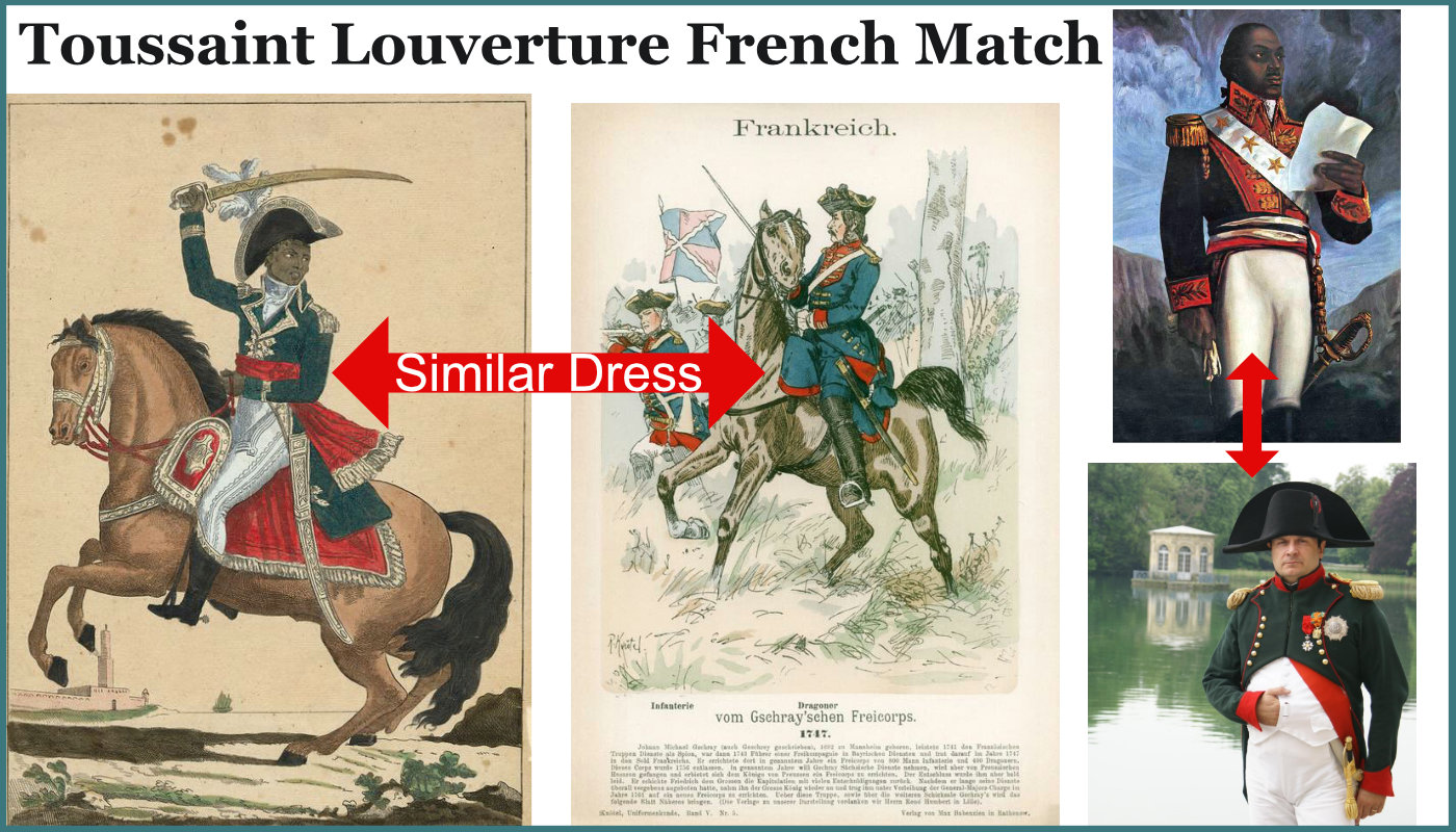 I am 99.99% Sure that he was a French man because he identified as being French, his style was French, His posture was French and last but NOT least, he was a French Jacobin. Which was similar to a Jacobite only difference was that it was a member of French society. I’m led to believe that the genocide of the original dark Anglo-Saxons in England also happened in France. No way should he be dressed so elaborately and exactly like a French soldier, NOT an ex-Caribbean slave. He most likely went to Haiti because his people were sent there from France, so he fought to save them. See how he compares with a french man.