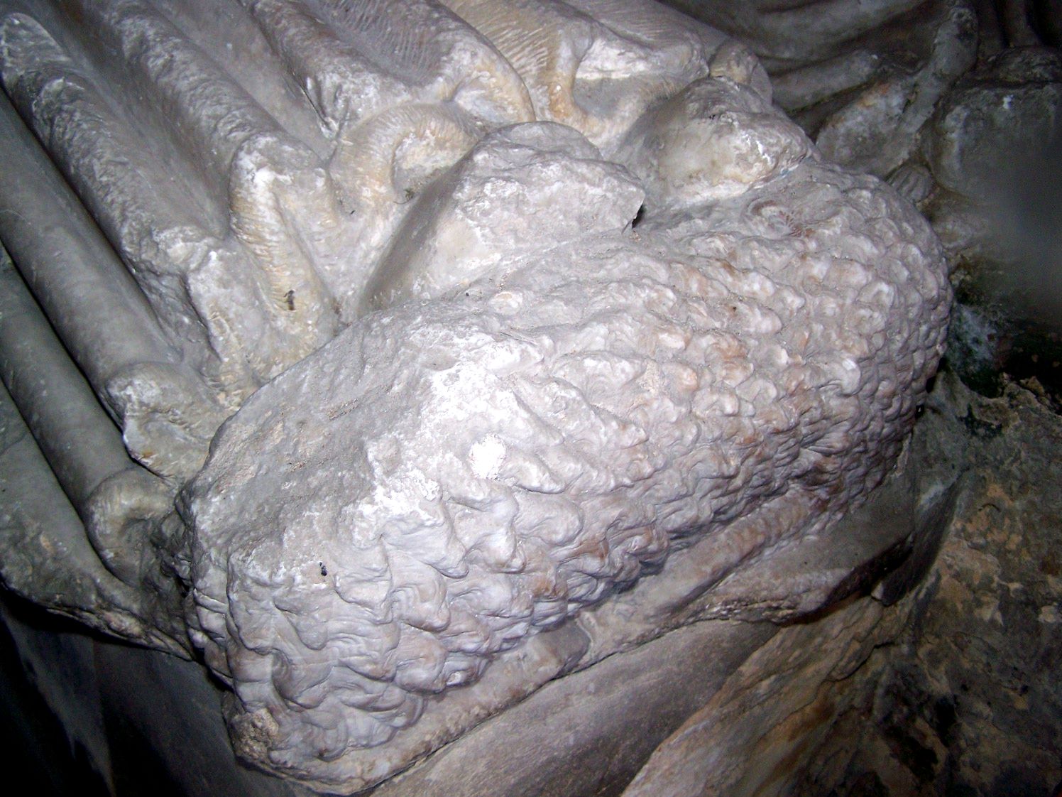 John’s face has suffered severe destruction. The surface has been deliberately worked over, leaving only the broad bridge of the nose and the outline of hair, which appears to have been sanded down into a hat-like form.