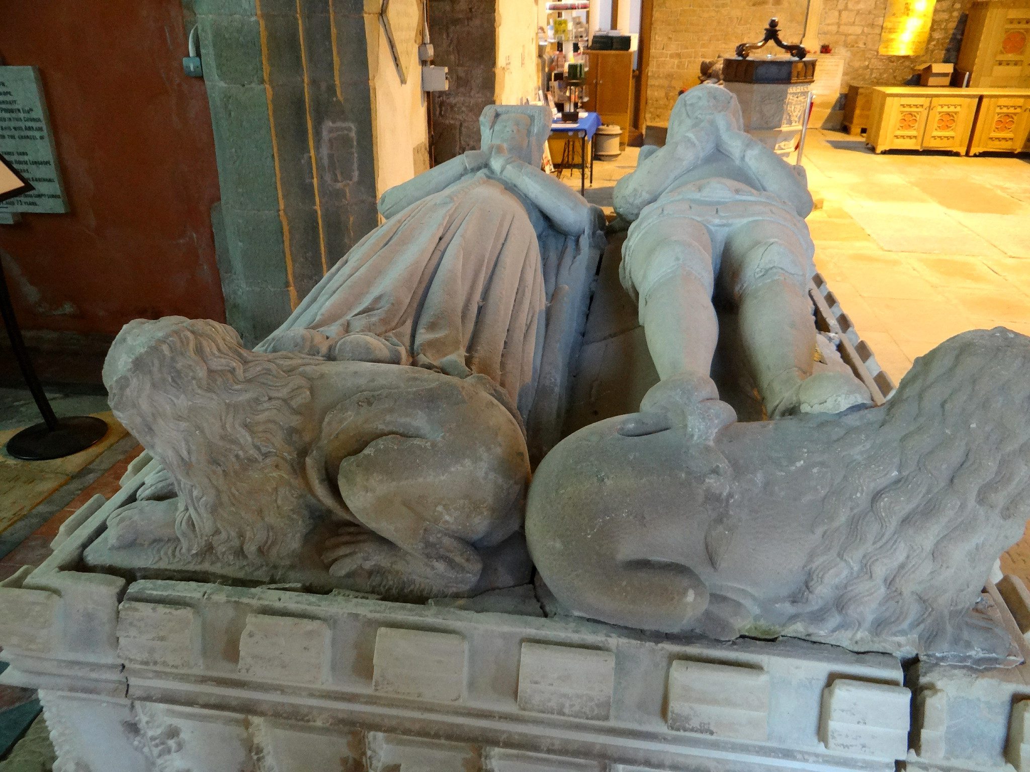 Sir John is shown wearing armour with his head resting on a helmet, while both husband and wife have lions at their feet, symbols of nobility, courage, and status.