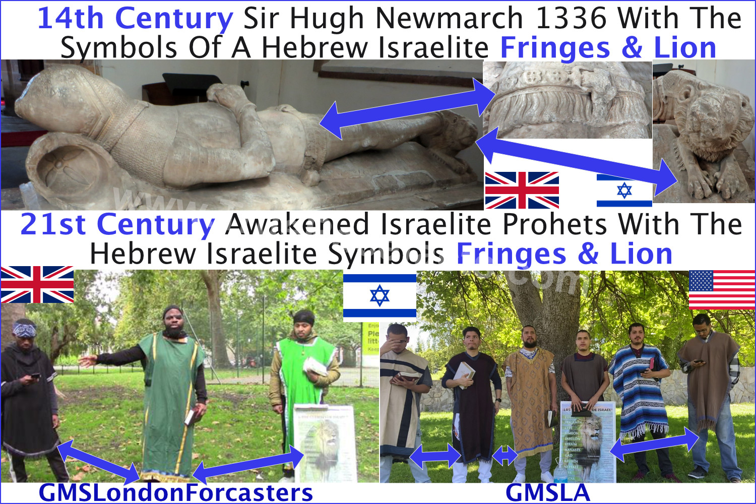 Sir Hugh Newmarch 1336- c 1380, Lord of the Manor of Whatton, the monument was intentionally destroyed, particularly on the face, to hide his handsome negroid features. I have outlined his nose and lips because the outline is still prominent after the destruction and easy to determine with the naked eye what it would’ve been. This makes it easy to identify that he was a so-called BLACK man that identified as a Hebrew Israelite because his monument feet are resting on The Roaring Lion of Judah. His outfit is trimmed in fringes, which is also a signification that Sir Hugh NewMarch identified as a Hebrew Israelite. See biblical verses below.