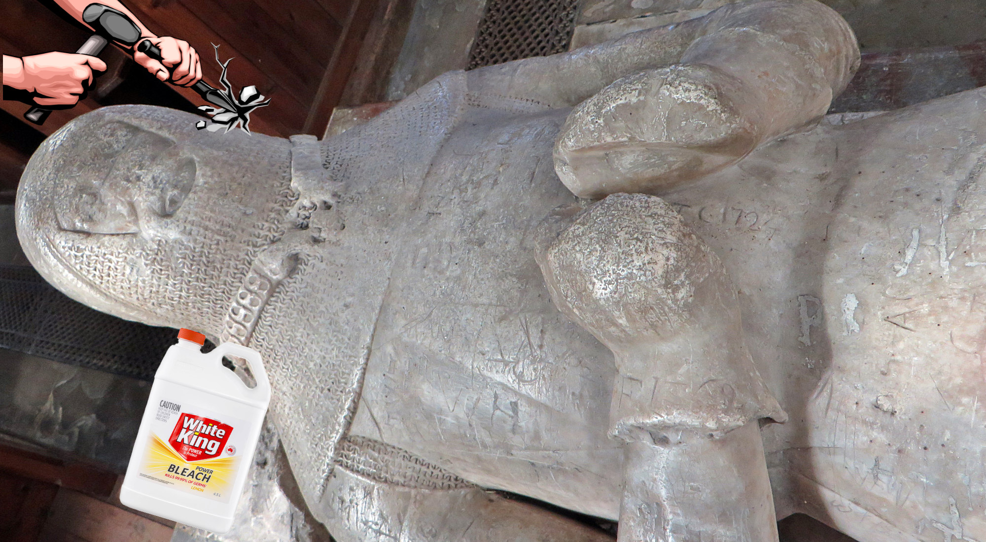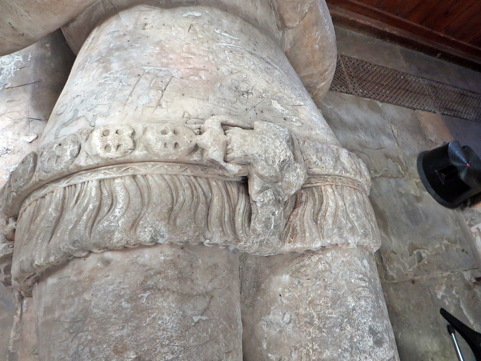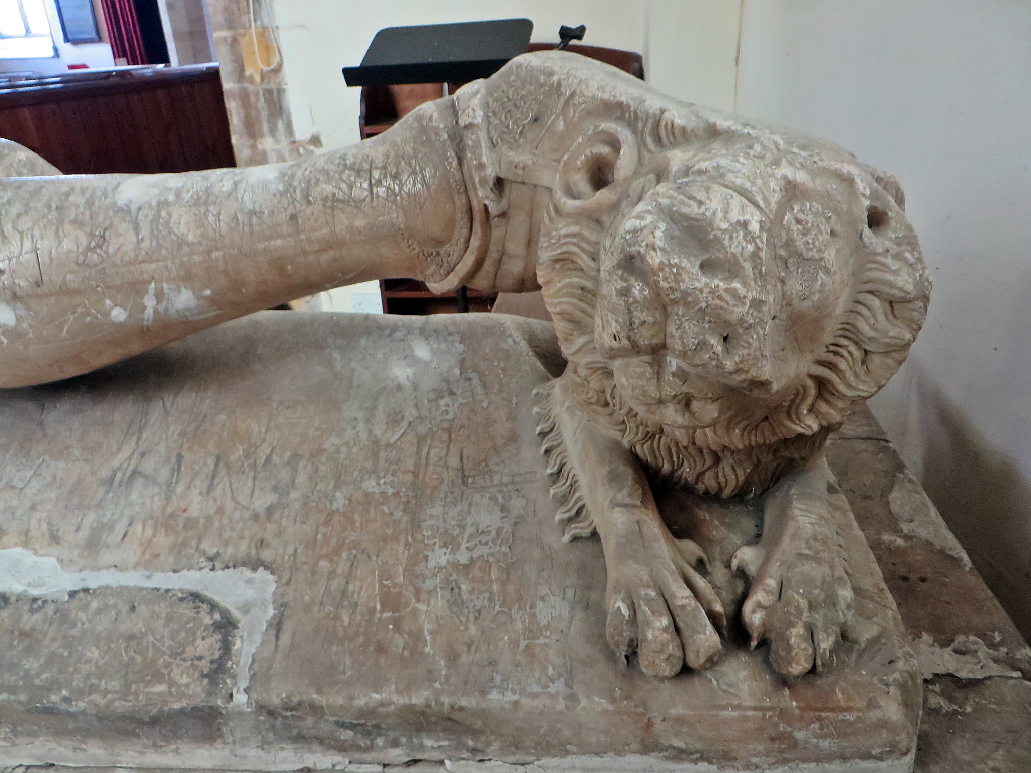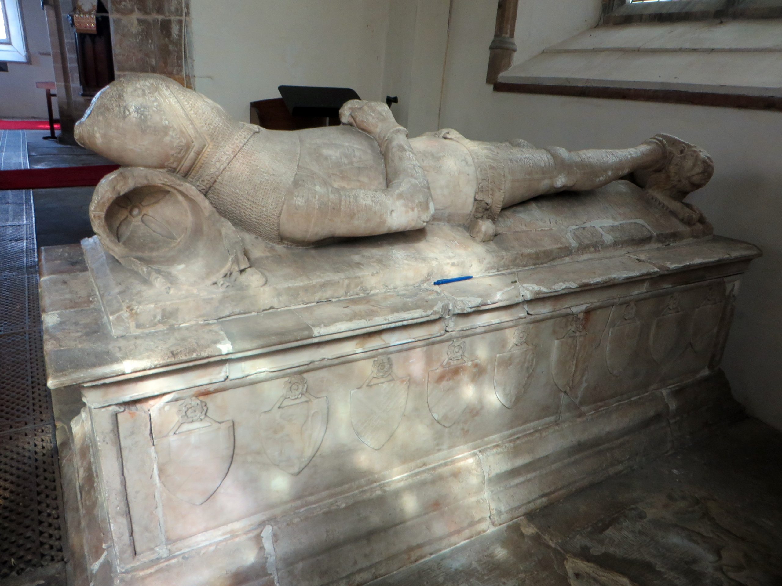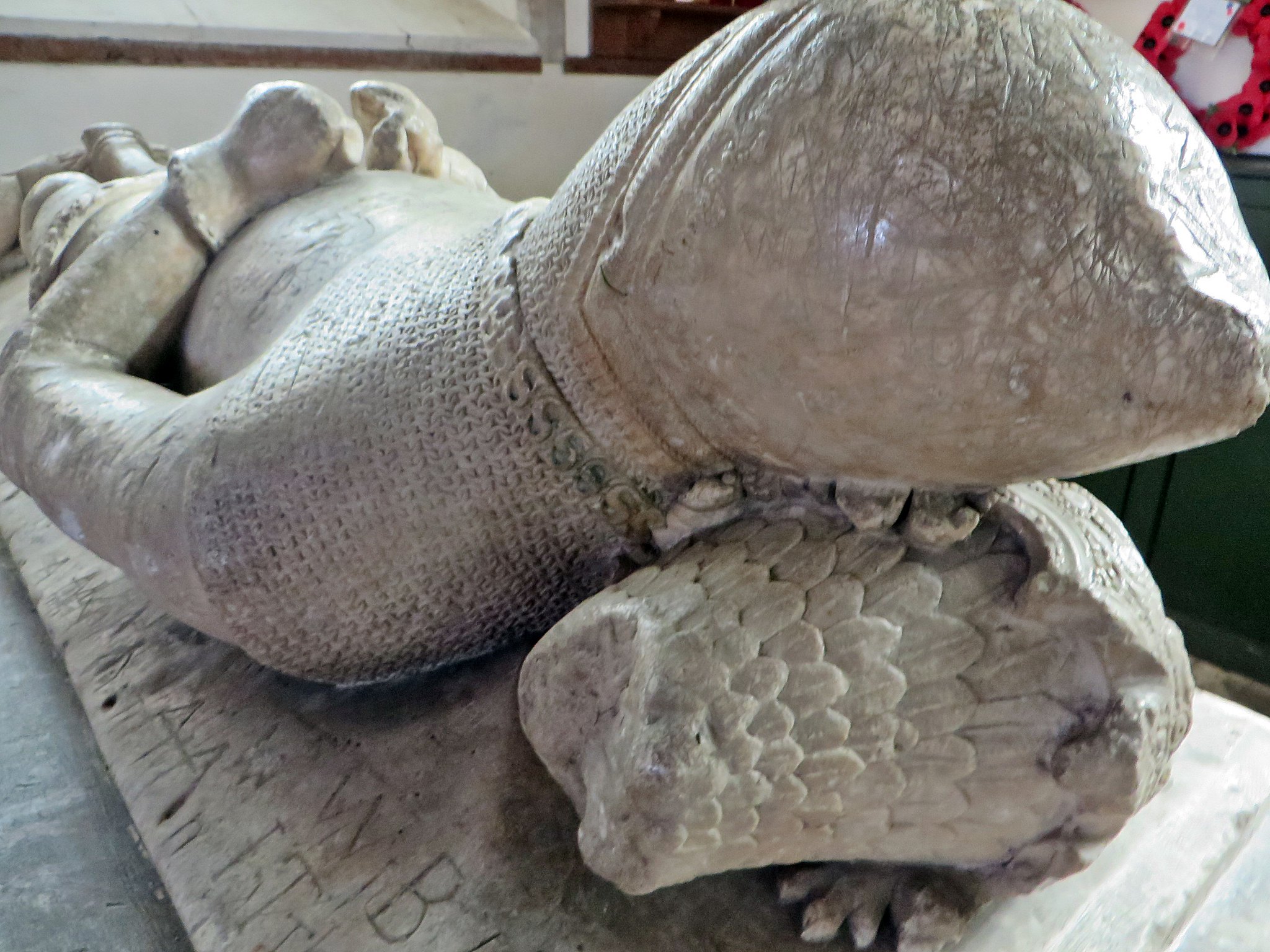 Made of alabaster, he has chain mail and a Lancastrian SS collar. Sadly part of his right foot and the left leg below the knee are missing. The damage caused, it is said by the churchwarden using the effigy to break firewood when heating the building before the services. The monument also has numerous graffiti written by bored pupils when the area was used as a school room.