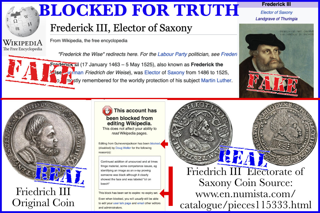Wikipedia BLOCKED me permanently from editing because I added authentic images of Frederick III, Elector of Saxony aka Frederick the Wise. This is what you call whitewashing iconoclasm at it's finest. Frederick was the son of Ernest, Elector of Saxony and his wife Elisabeth, daughter of Albert III, Duke of Bavaria. He is notable as being one of the most powerful early defenders of Martin Luther