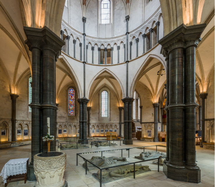 The Temple Church is a Royal peculiar church in the City of London located between Fleet Street and the River Thames, built by the Knights Templar as their English headquarters. It was consecrated on 10 February 1185 by *Patriarch Heraclius of Jerusalem. During the reign of King John (1199–1216) it served as the royal treasury, supported by the role of the Knights Templar as proto-international bankers. It is now jointly owned by the Inner Temple and Middle Temple Inns of Court, based of the English legal profession. It is famous for being a round church, a common design feature for Knights Templar churches, and its 13th- and 14th-century stone effigies. It was heavily damaged by German bombing during World War II and has since been greatly restored and rebuilt. *Proof we NEVER lost sight of our roots in Israel